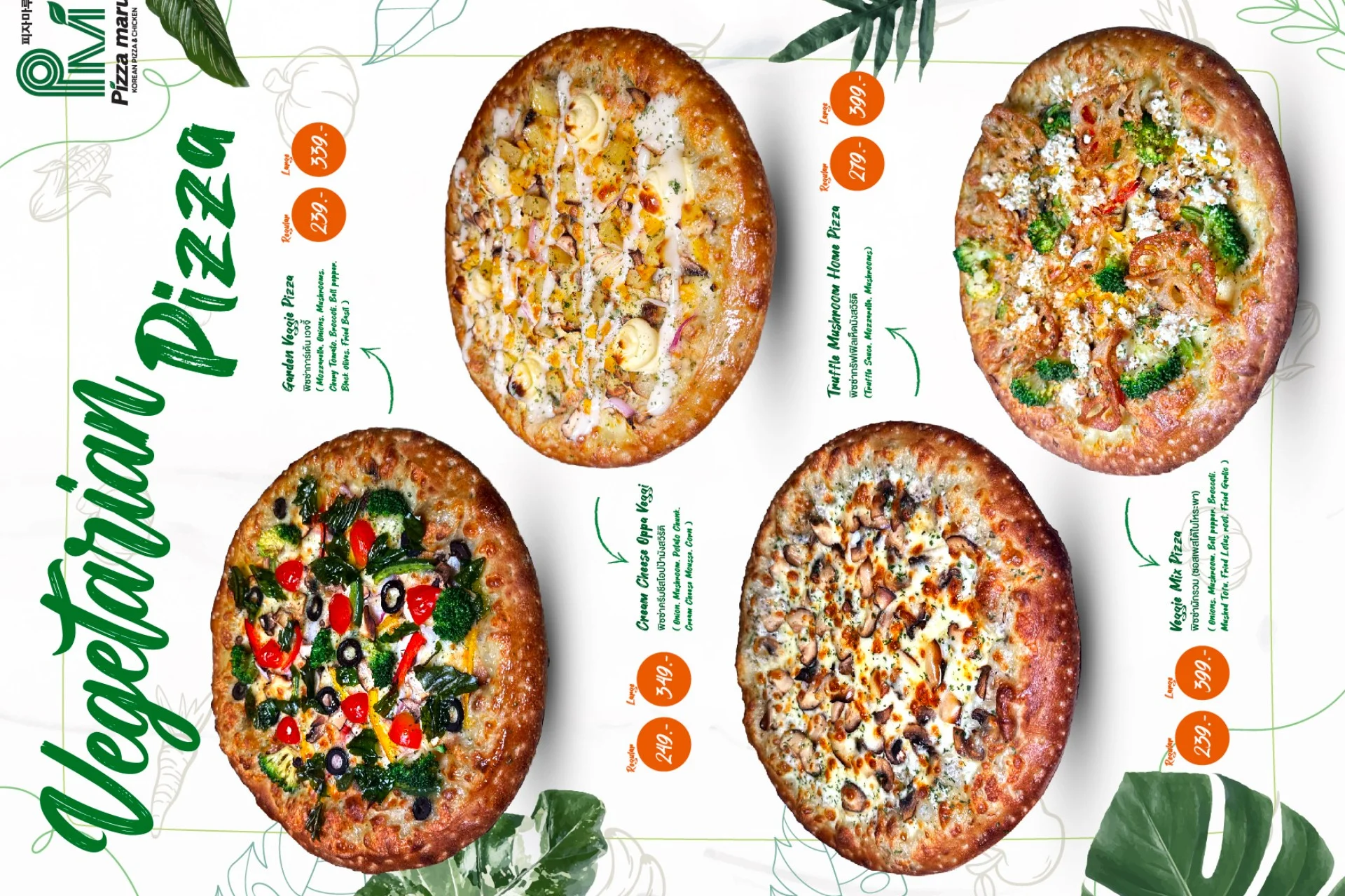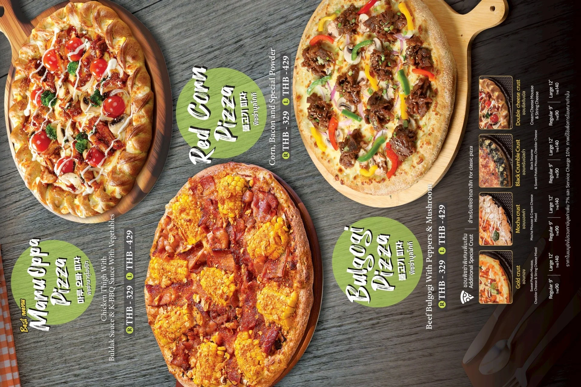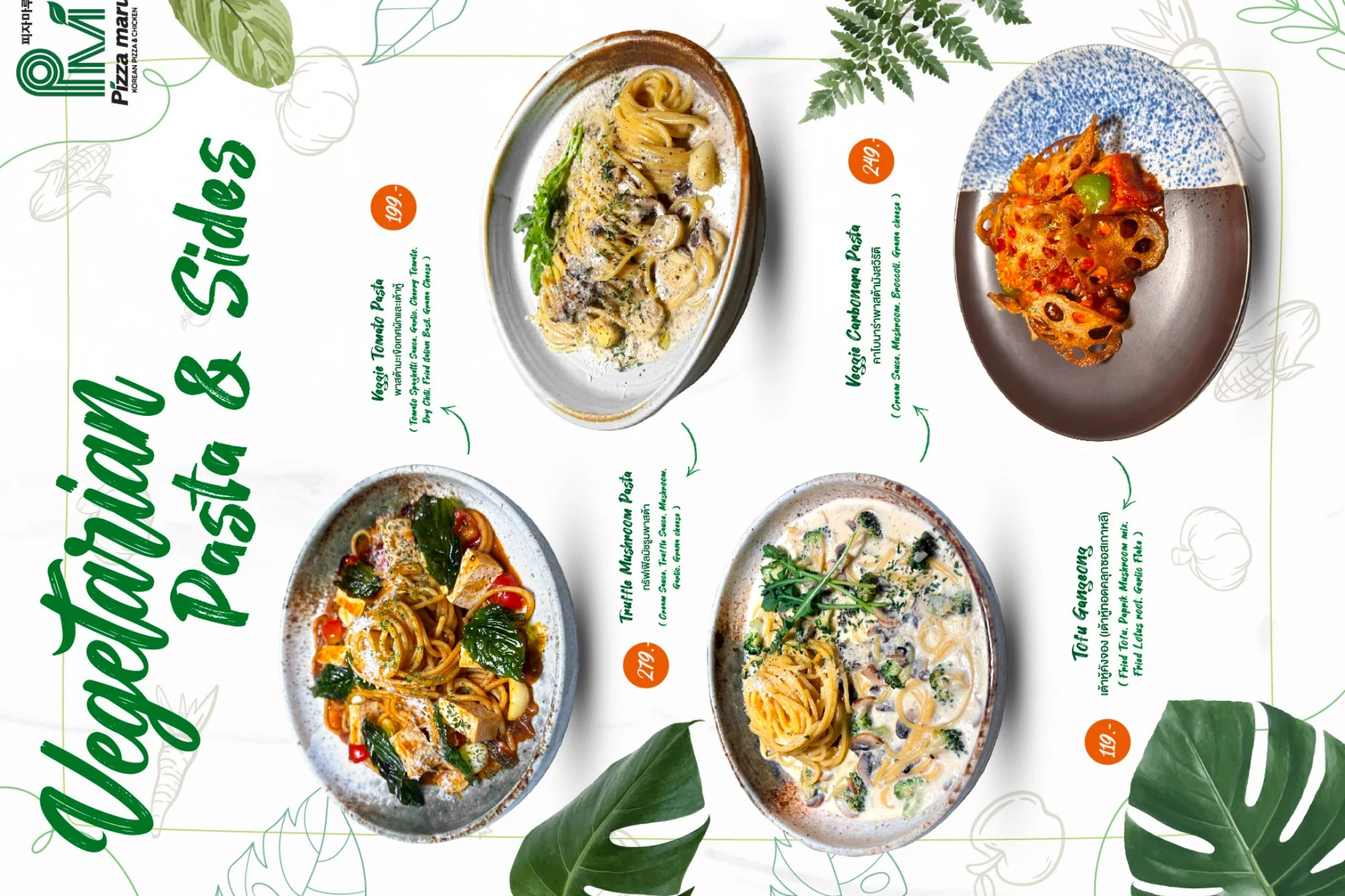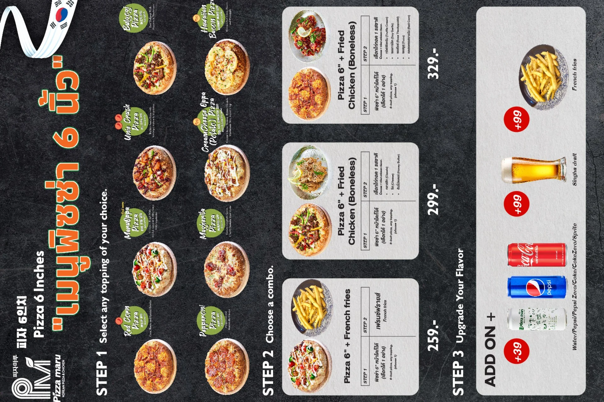 Best-selling menu of Pizzamaru are : Chicago Pizza, Bulgogi Pizza, Twisted Edge, Gold Edge, Garlic Gangjeong Chicken, Vegetable Chicken, Shrimp rose pasta, Japchae Pasta/ Jjajang Pasta and Rice Tower.