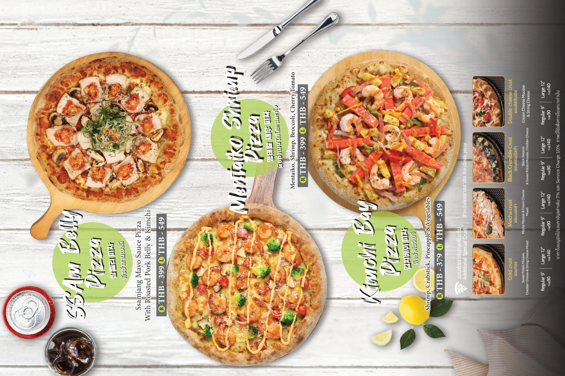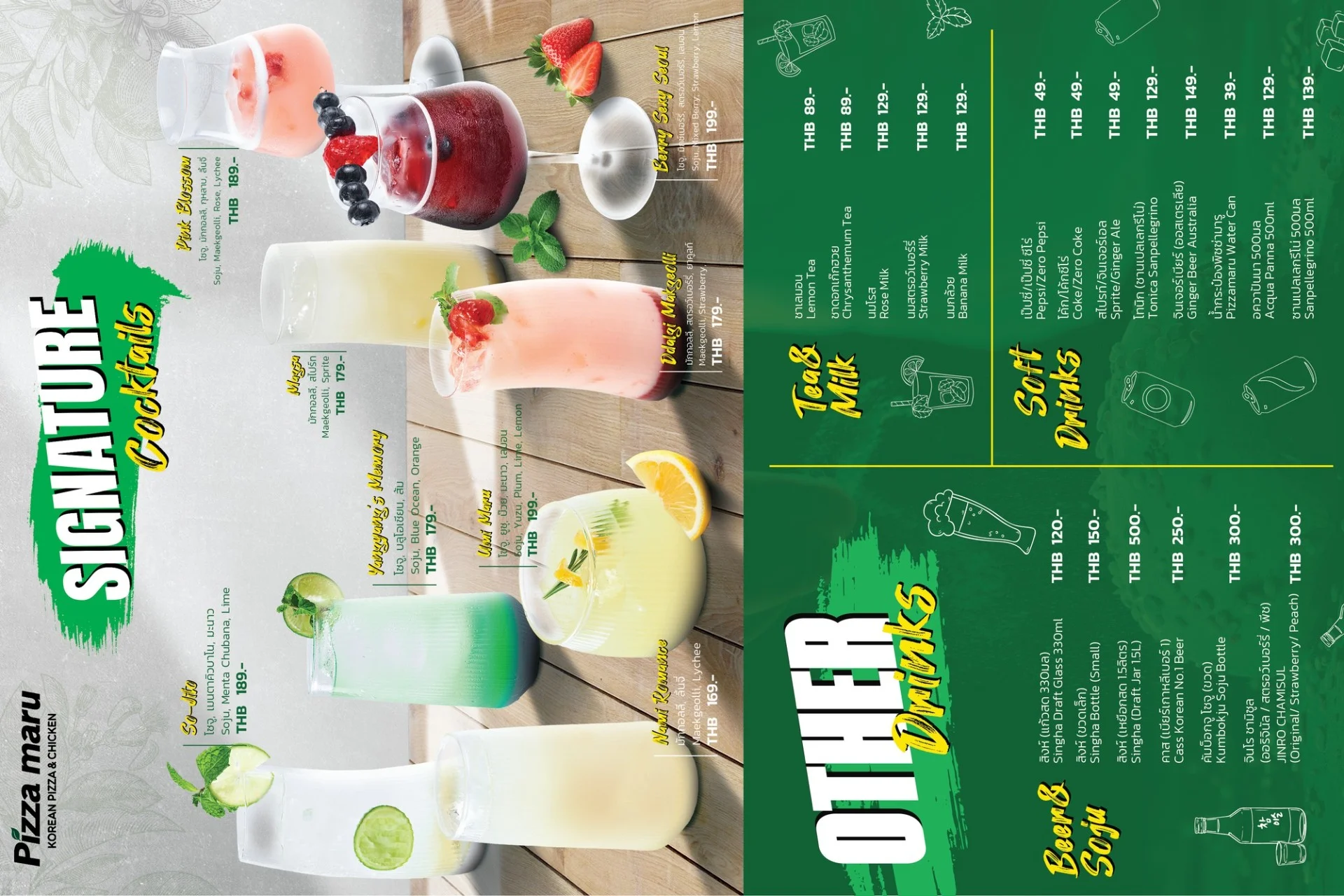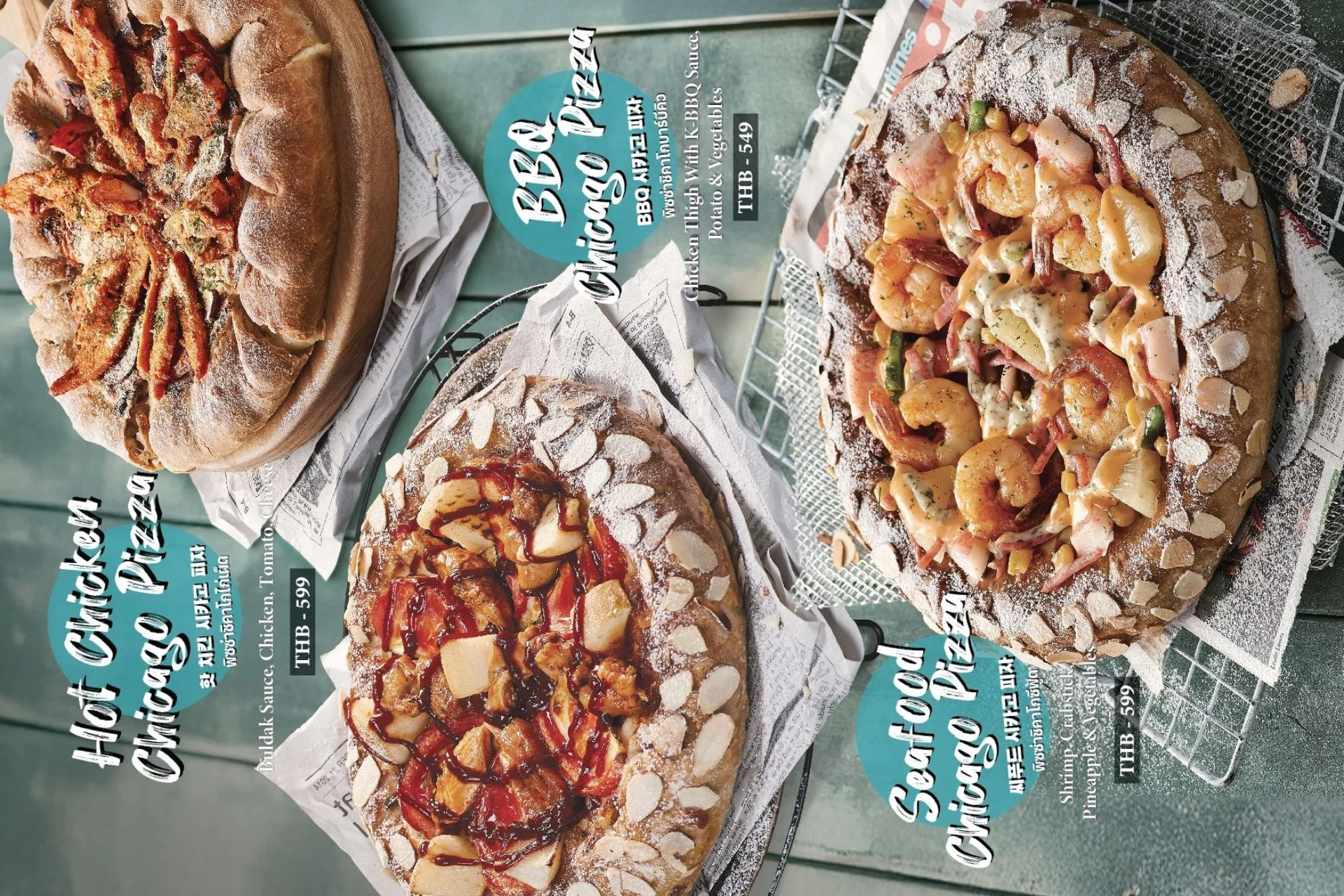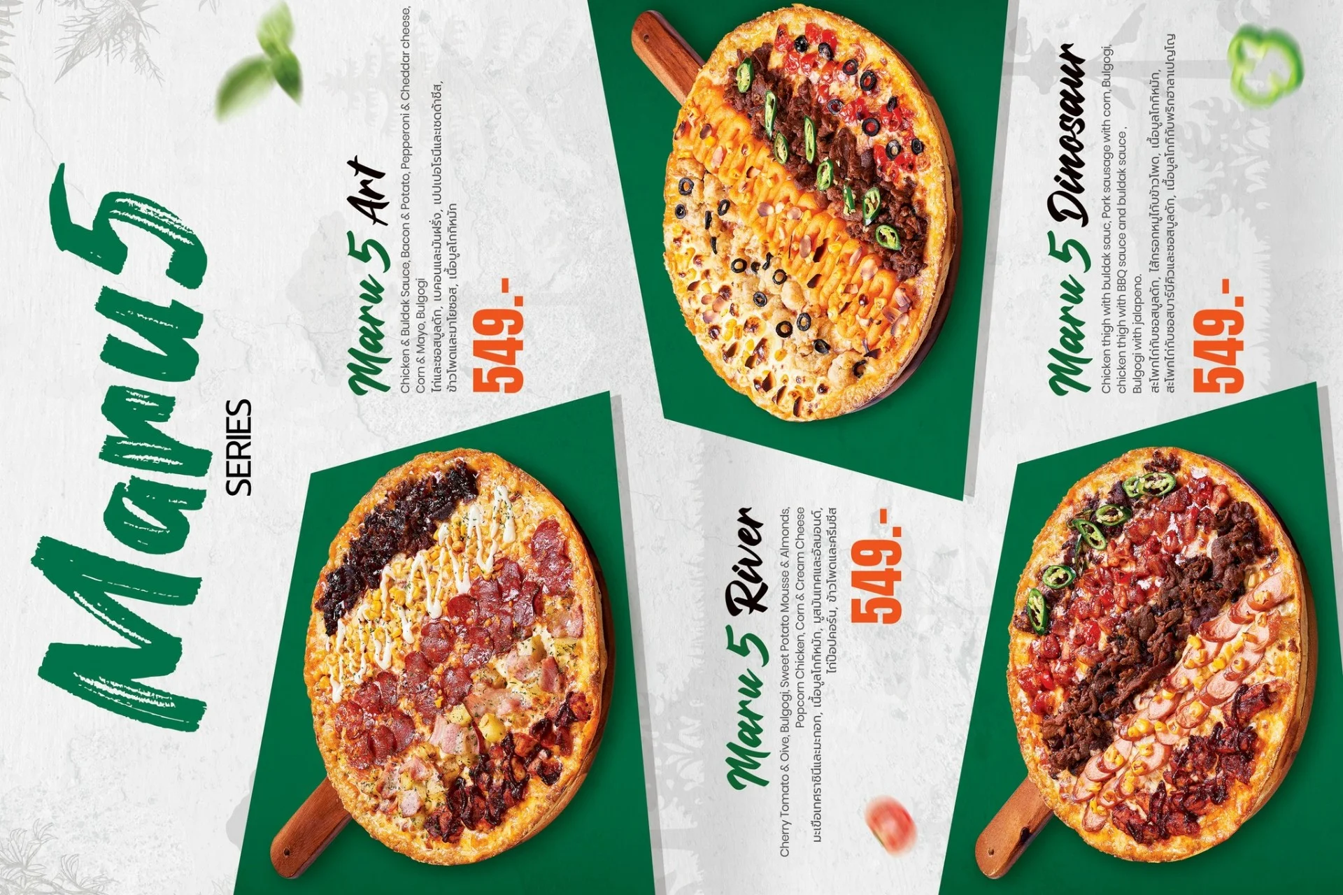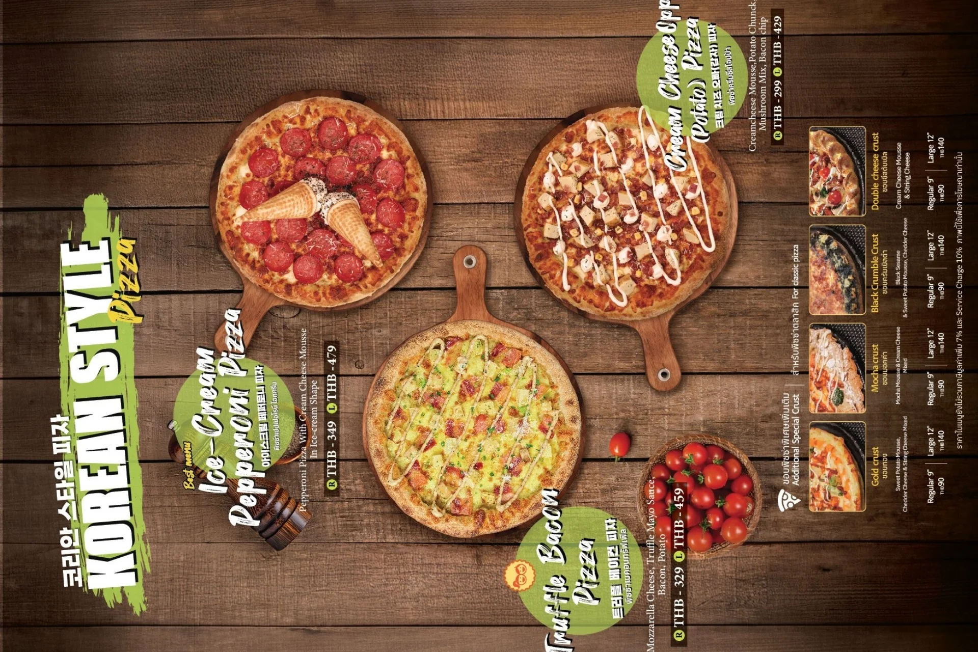 Best-selling menu of Pizzamaru are : Chicago Pizza, Bulgogi Pizza, Twisted Edge, Gold Edge, Garlic Gangjeong Chicken, Vegetable Chicken, Shrimp rose pasta, Japchae Pasta/ Jjajang Pasta and Rice Tower.