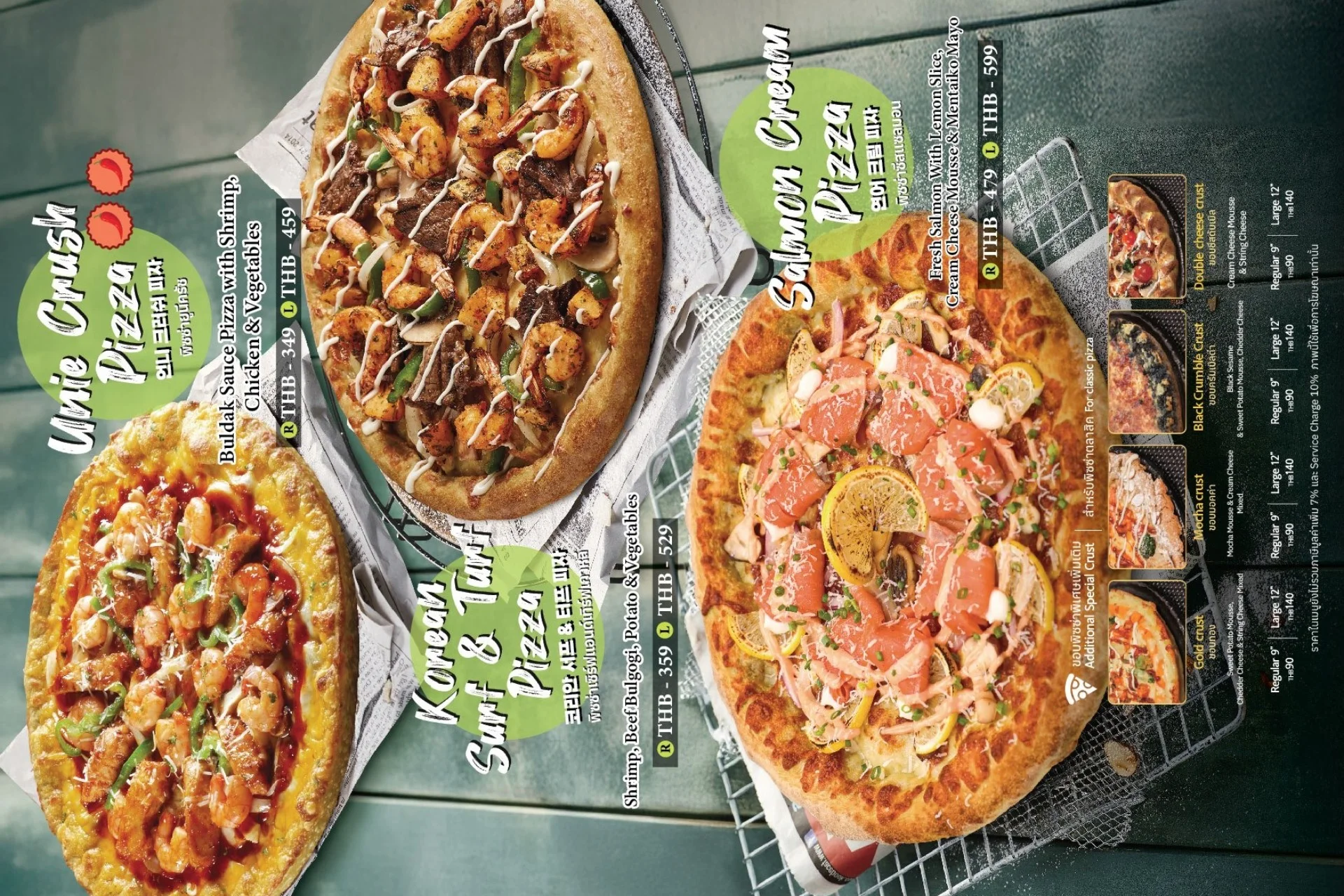 "Pizzamaru is incredibly popular in Korea, with over 600 outlets. Can have 22 flavors, with 3 types of crusts, and 2 types of dough- Green Tea (which is a bit chewy and denser) and Black Rice Pilaf (it’s more fluffy and airy). Then 4 other types of other main dishes to indulge in too.