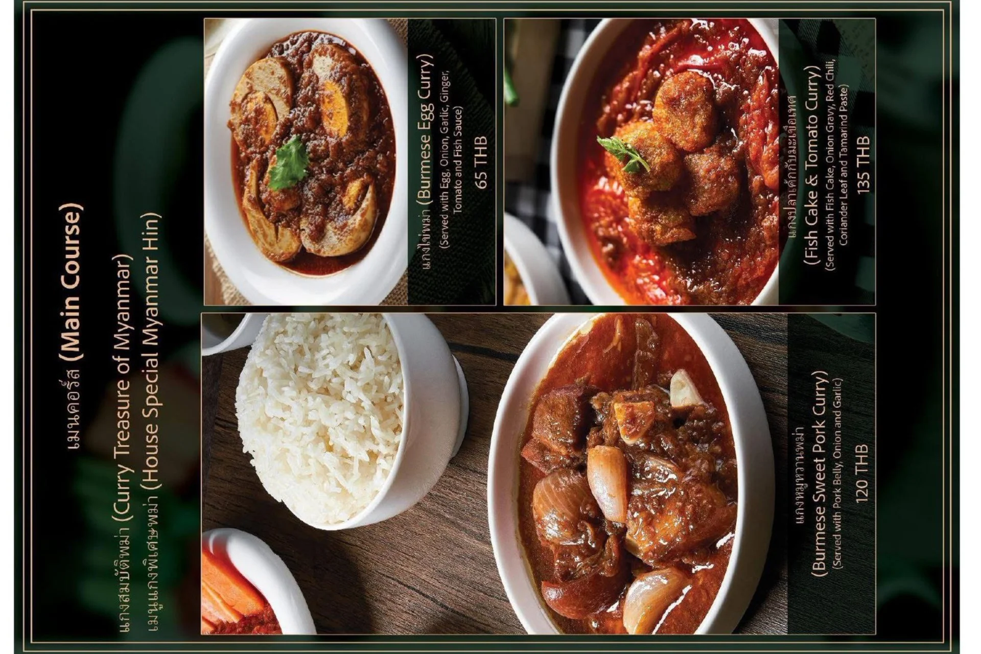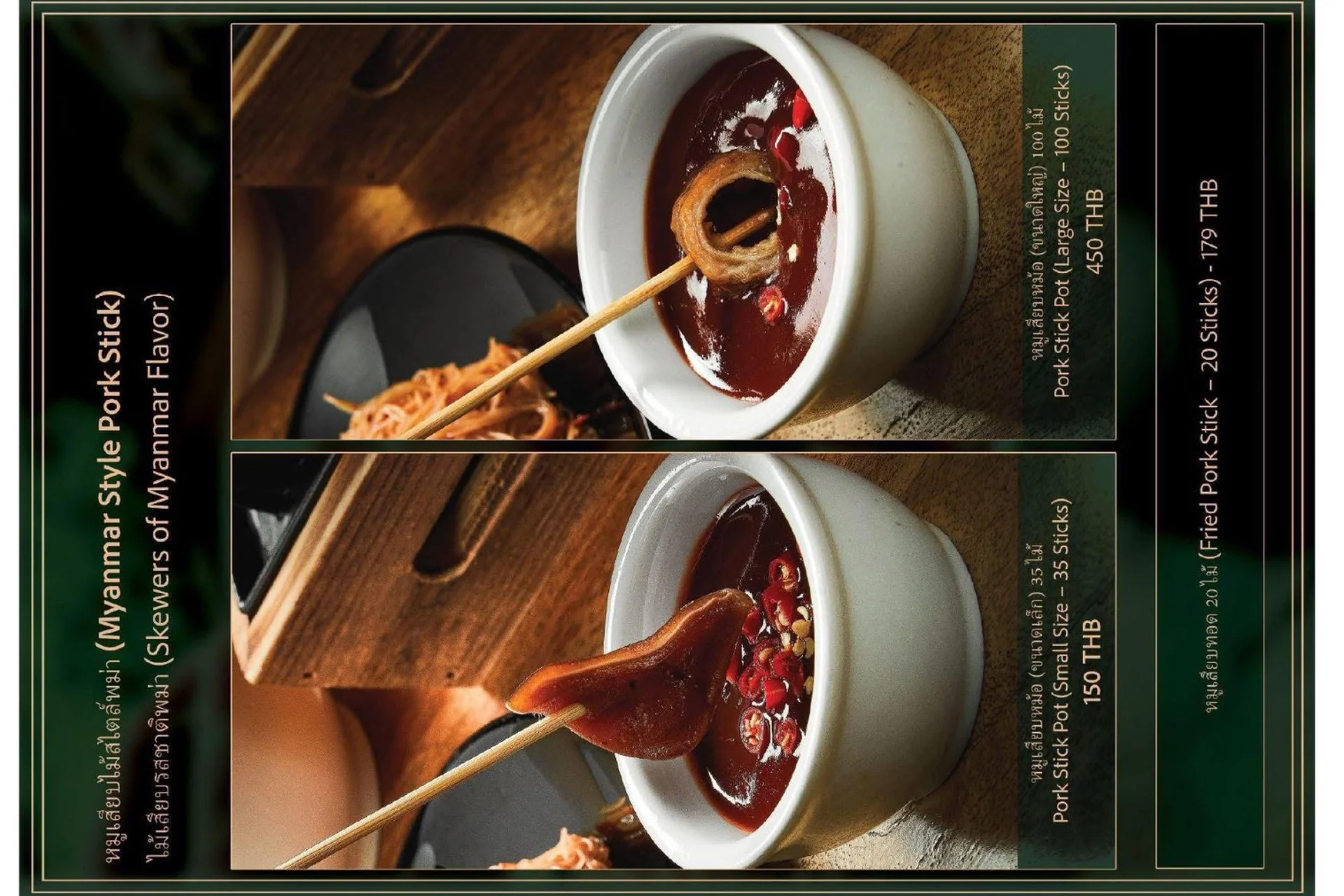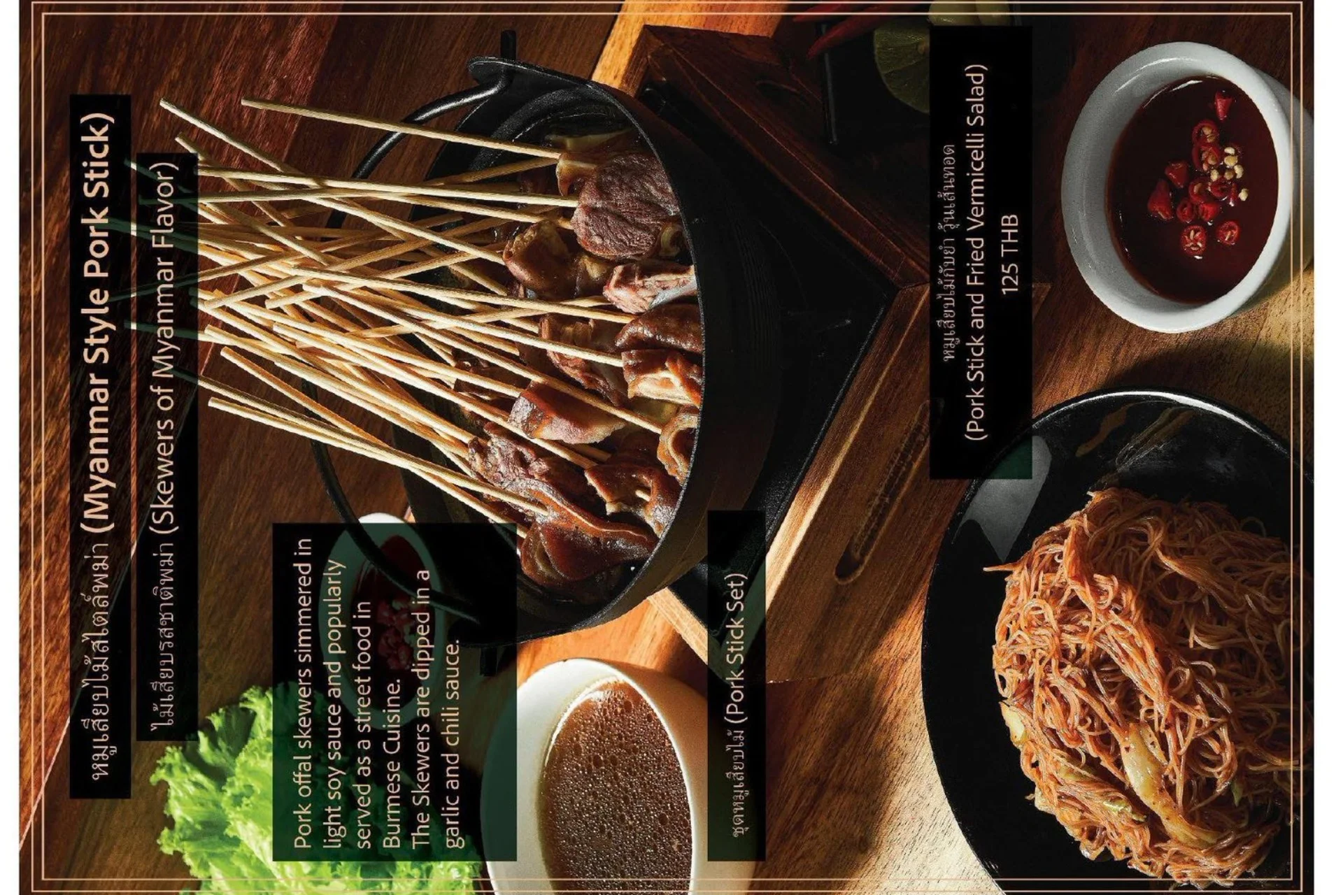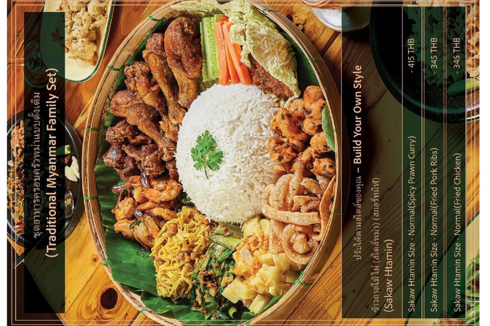 Experience the true flavors of Myanmar at our Burmese Restaurant, located in the heart of Bangkok, Thailand. Our menu features a carefully curated selection of dishes that represent the diverse culinary heritage of Burma. From our signature Burmese Pork Stick, mouthwatering Phat Htamin and the aromatic Sakaw Htamin to other renowned Burmese specialties, each dish is crafted with precision to transport your taste buds to the vibrant streets of Myanmar.