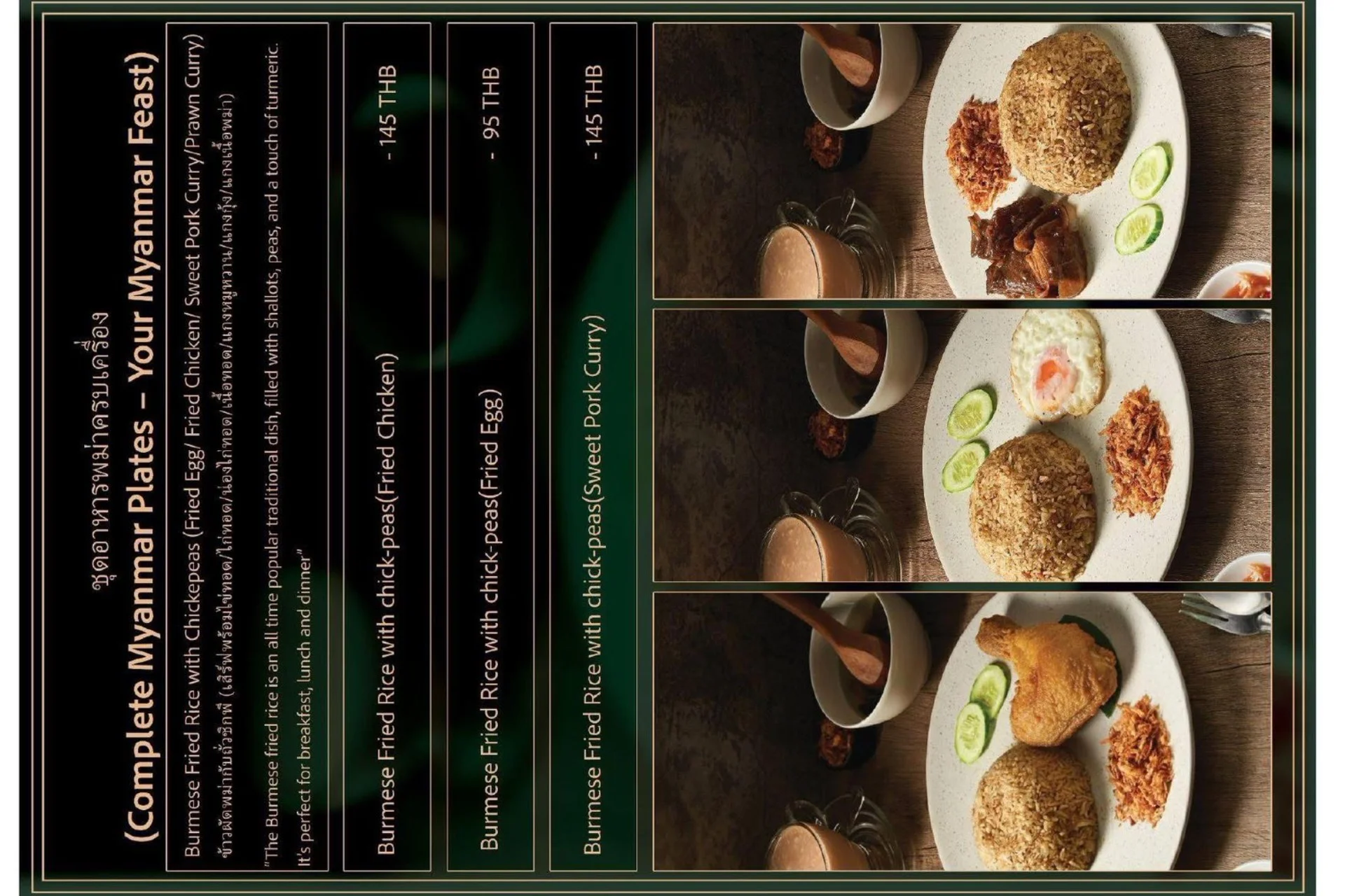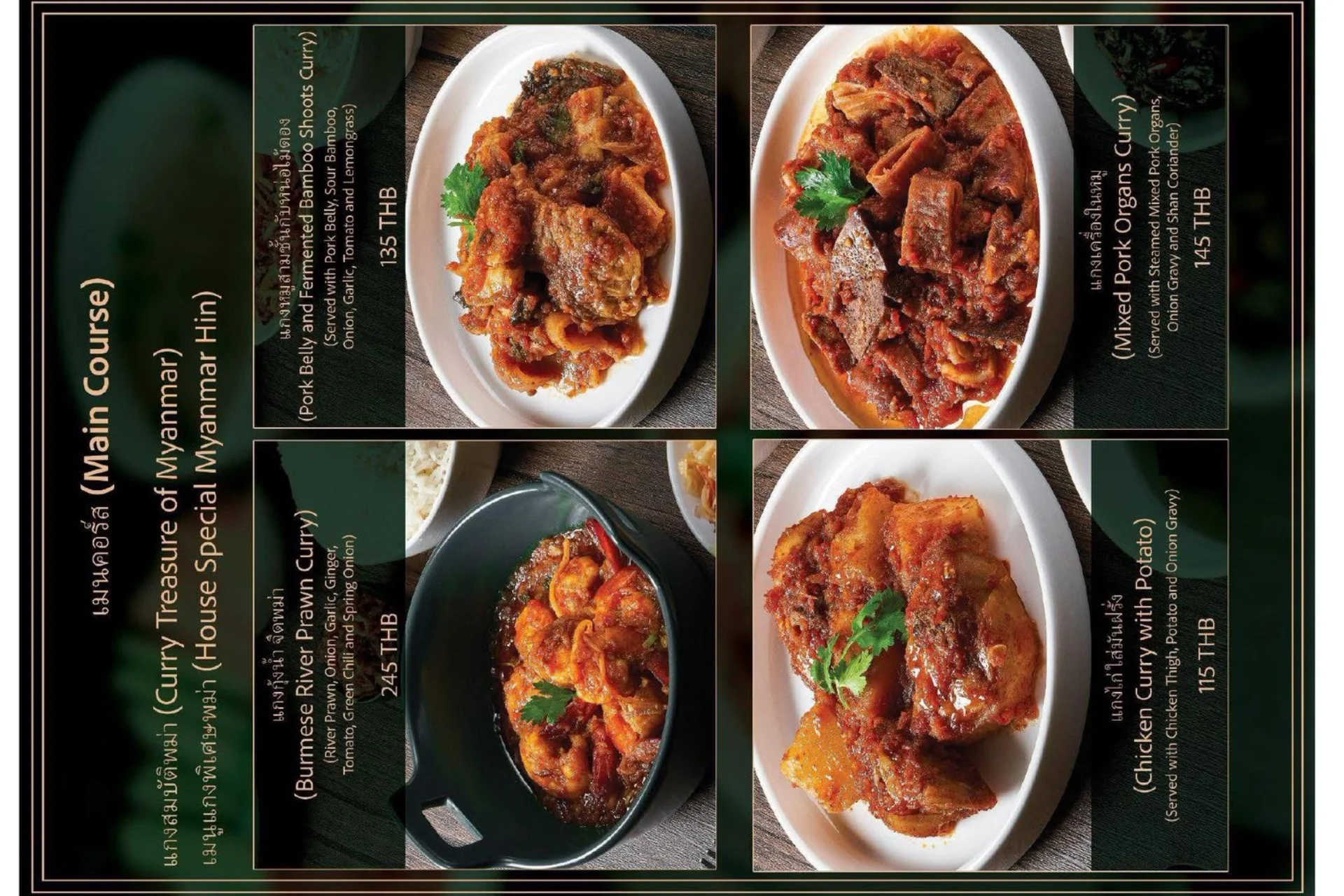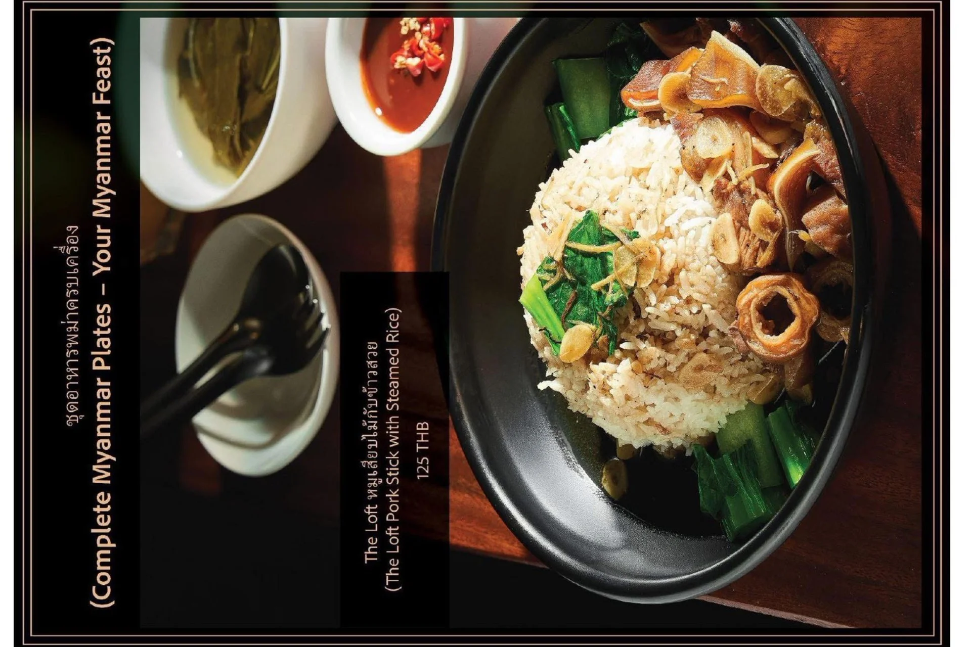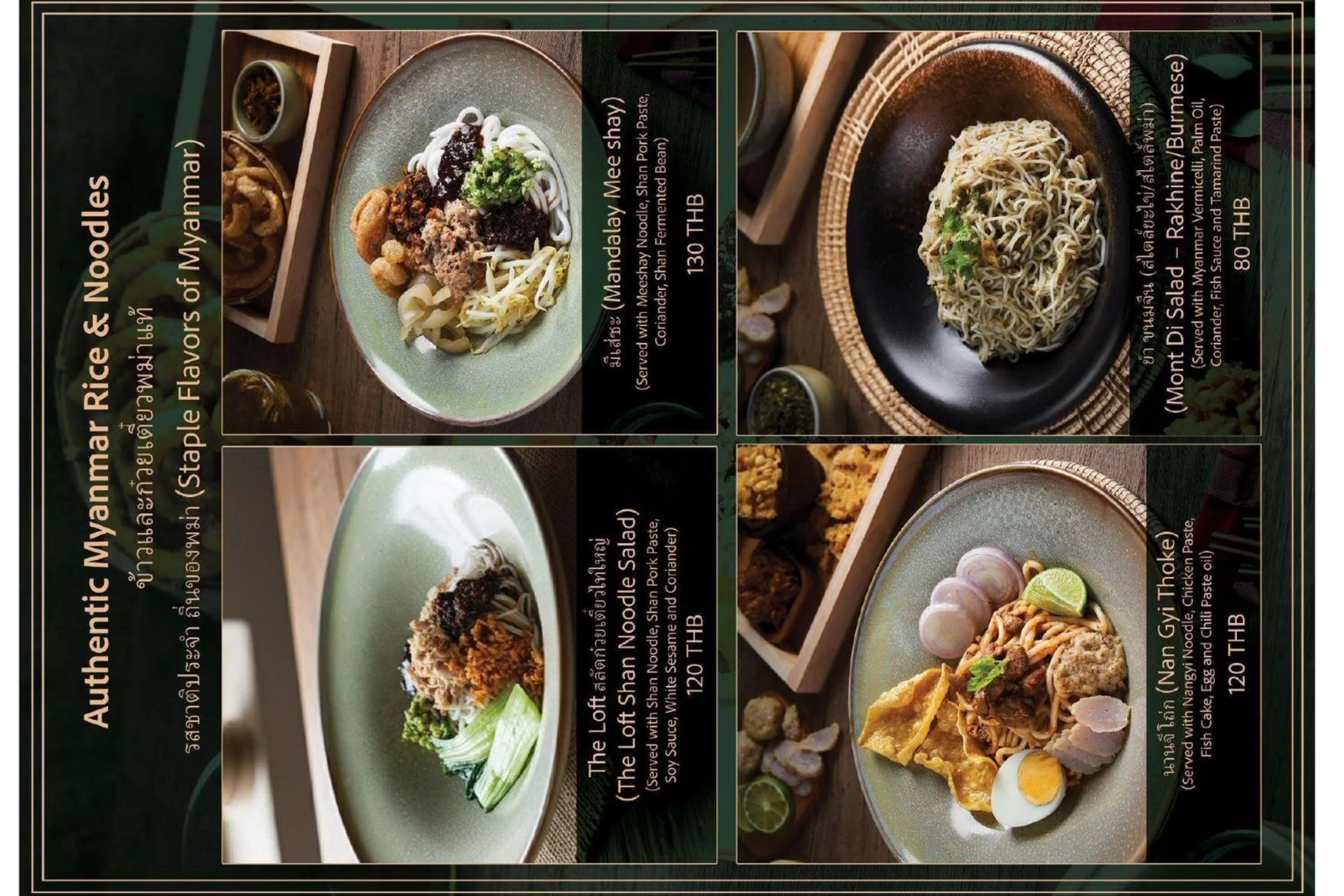 Experience the true flavors of Myanmar at our Burmese Restaurant, located in the heart of Bangkok, Thailand. Our menu features a carefully curated selection of dishes that represent the diverse culinary heritage of Burma. From our signature Burmese Pork Stick, mouthwatering Phat Htamin and the aromatic Sakaw Htamin to other renowned Burmese specialties, each dish is crafted with precision to transport your taste buds to the vibrant streets of Myanmar.