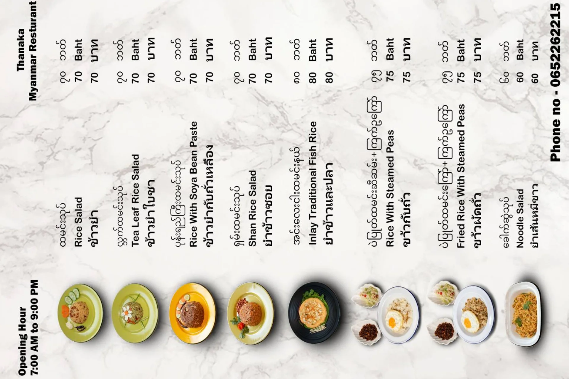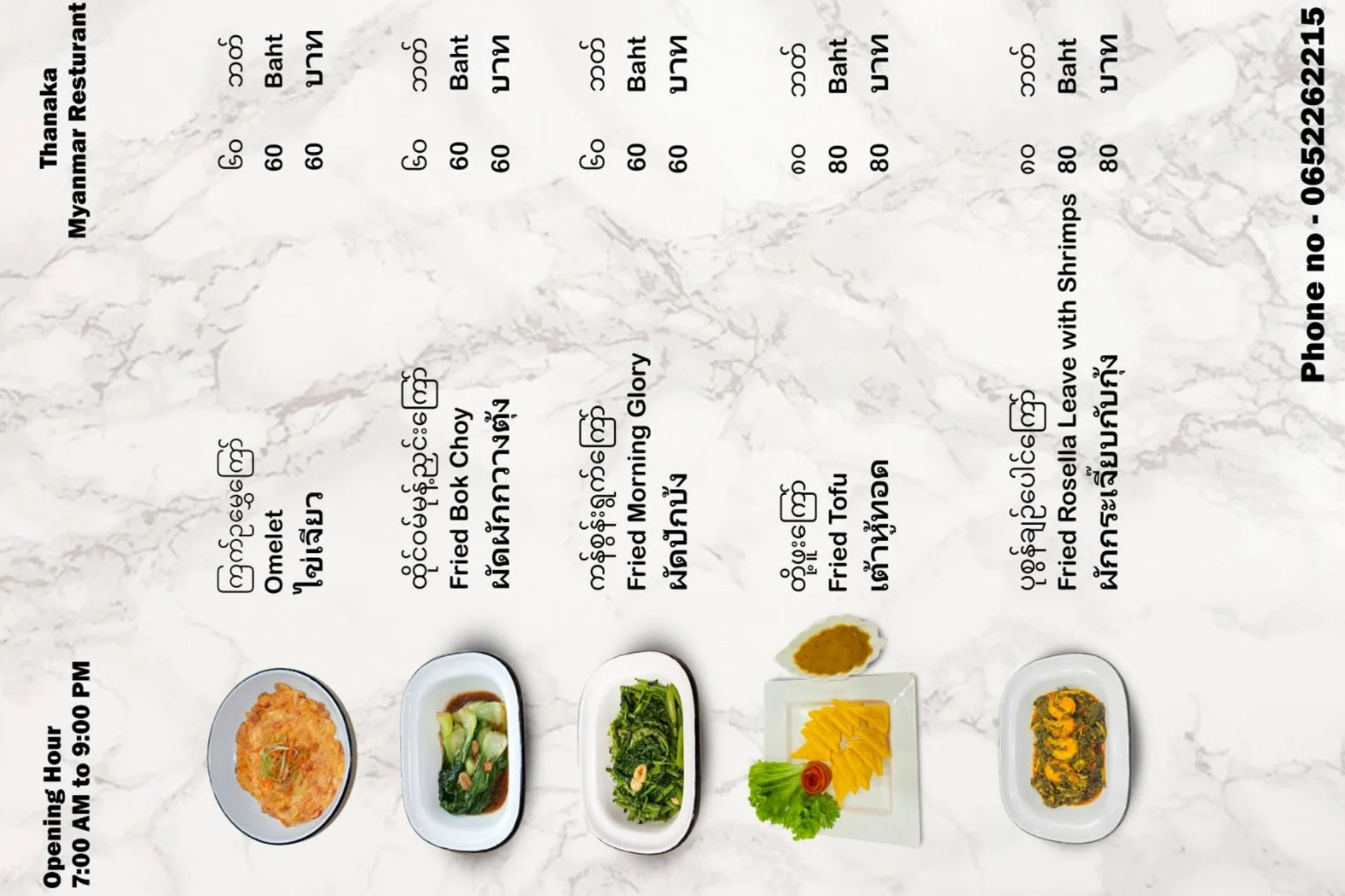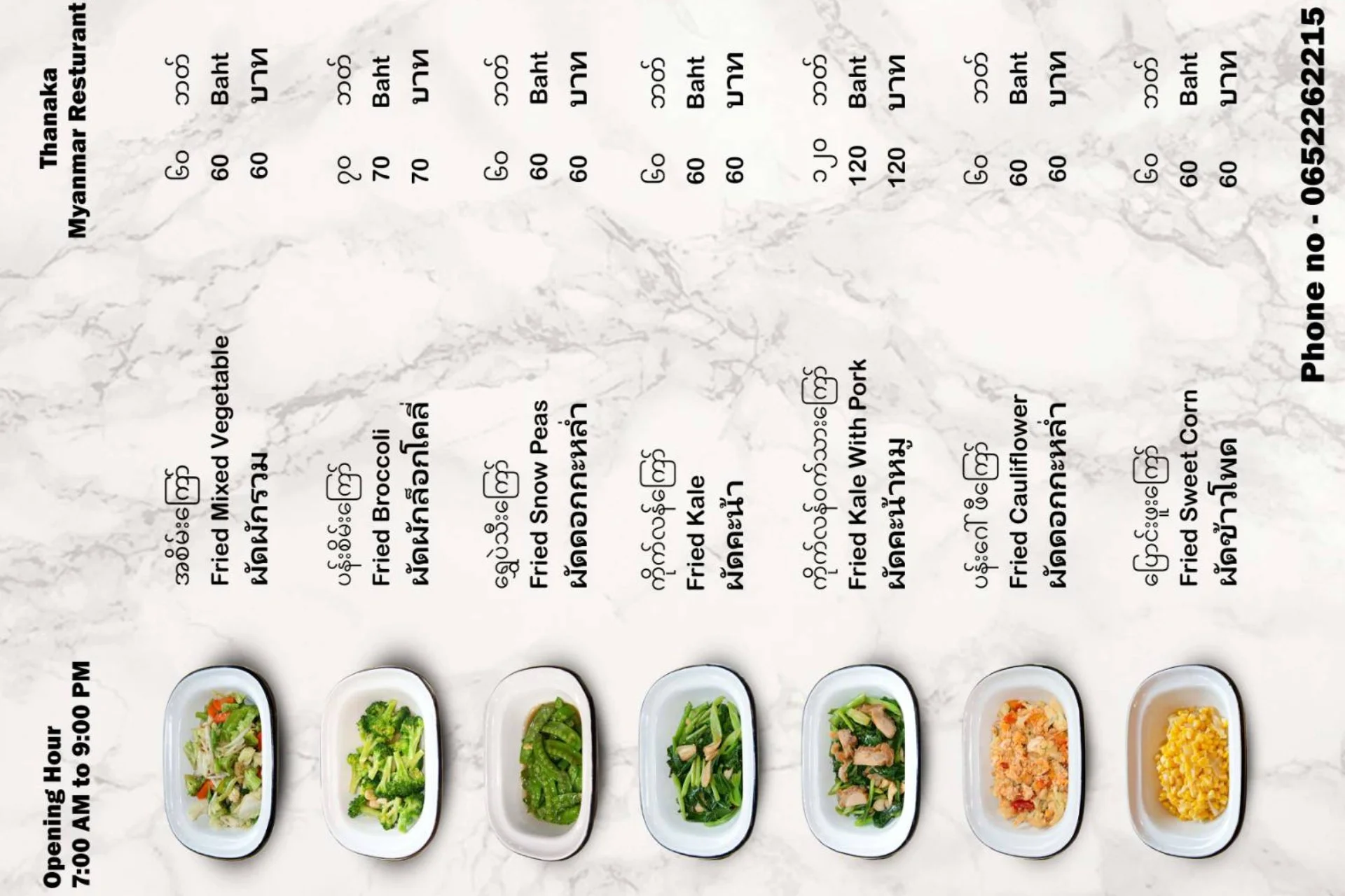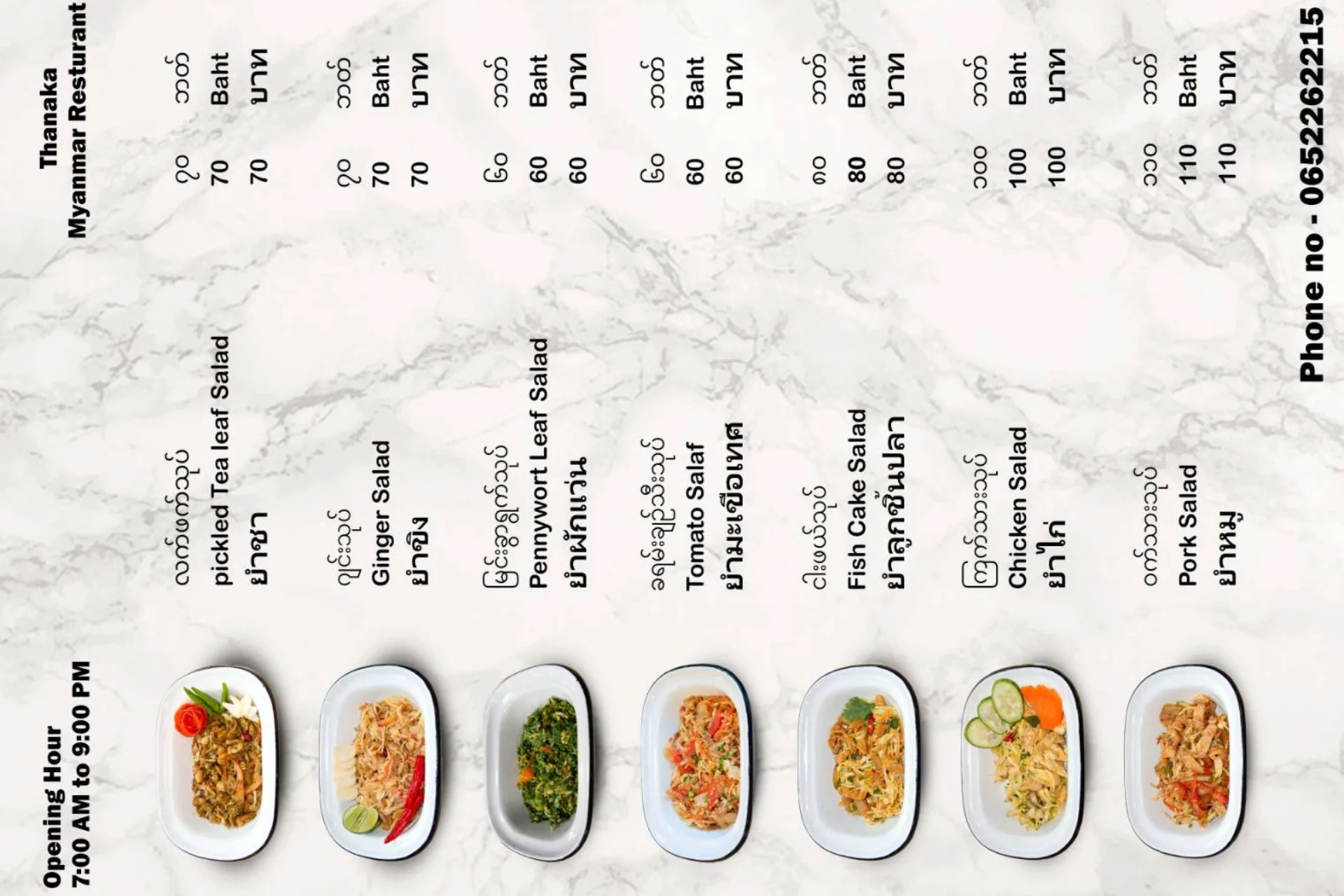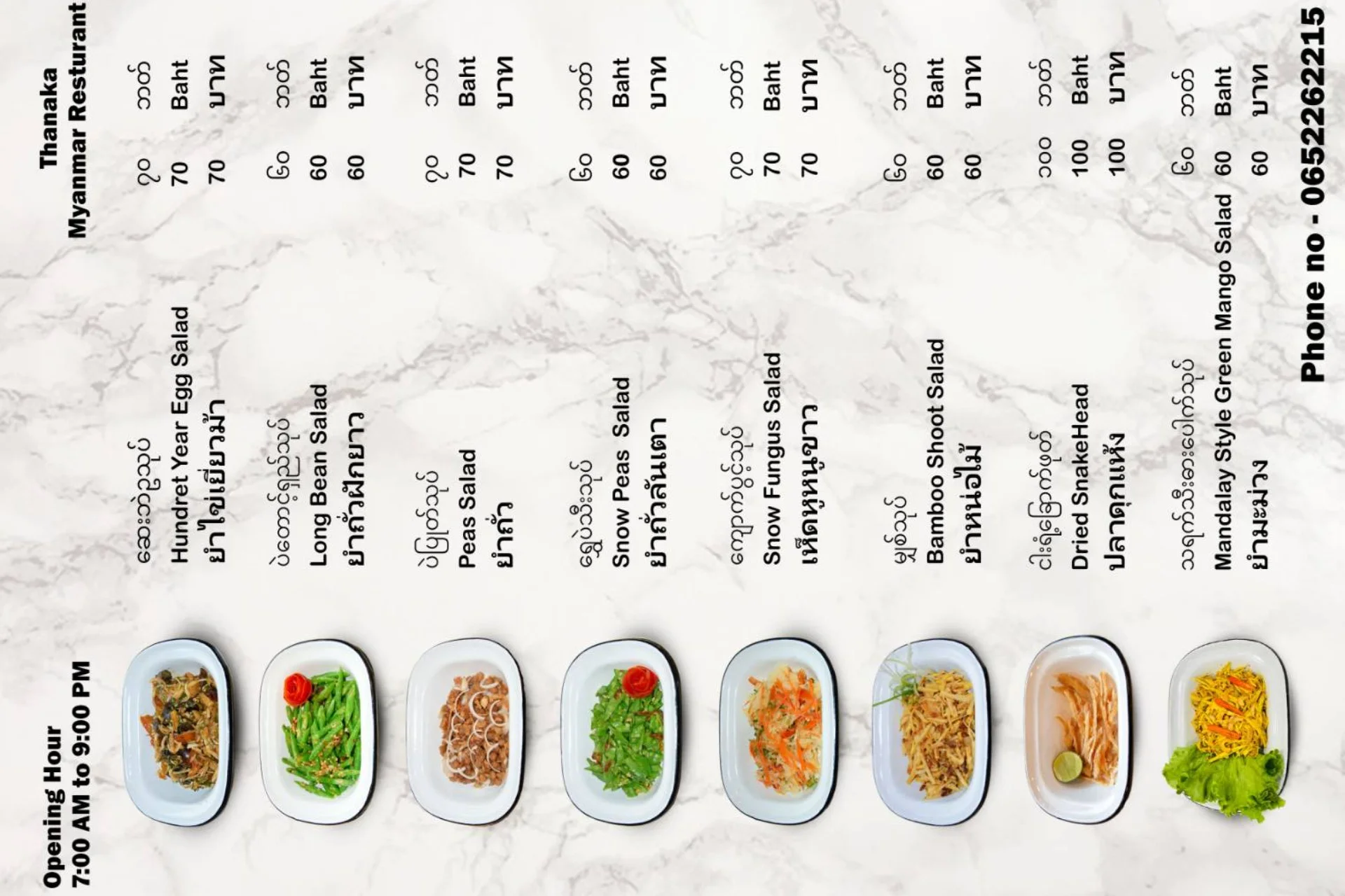 <p>Thanaka Myanmar Restaurant မှ Salad Menu များအားလုံးကို MyanLife Coupon ဖြင့် 10% Discount ရယူနိုင်ပါသည်။</p>